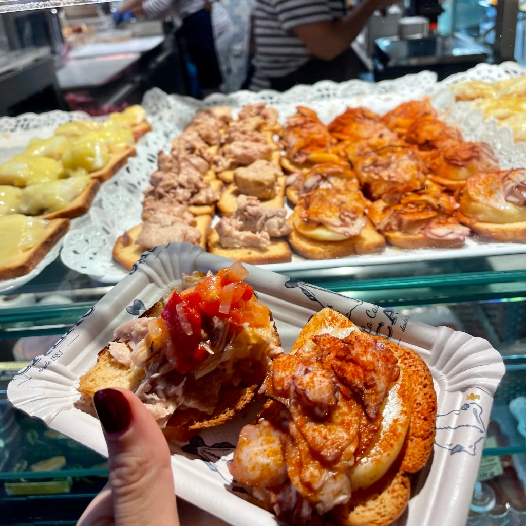 Ah, tapas is a typical snack everywhere in Spain, and I started my tour with croquettes and sardines at ‘Casa de Bacalao’ and ‘La hora del Vermut’ and more sea food in Mercado de Saint Miguel, in a historical building, now a gourmet tapas market.