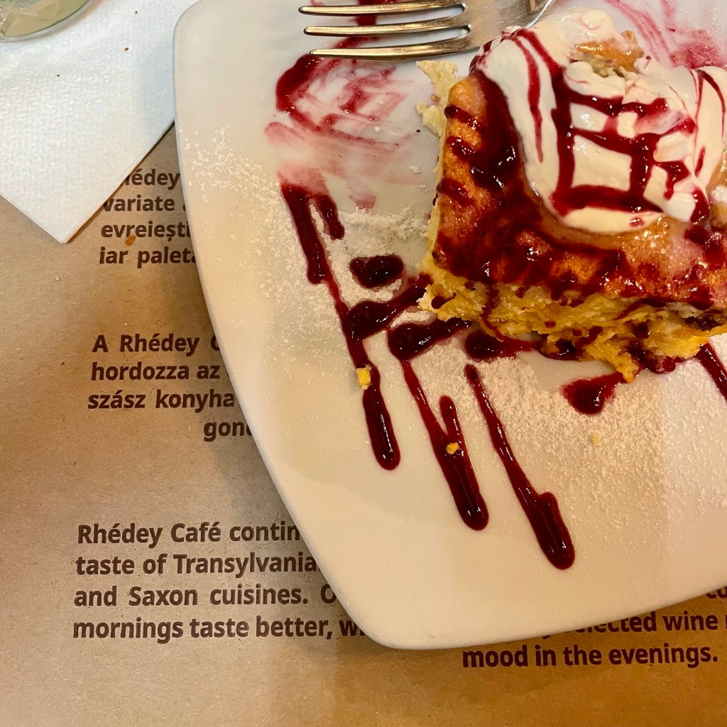 So I arrived in time for dinner at the traditional Rhédey Café in Union Square, and started with the recommended Transylvanian tarragon soup and continued with an original dessert from Cluj, Vargabéles, or sweet noodles cheese pie, with cottage cheese and raisins.