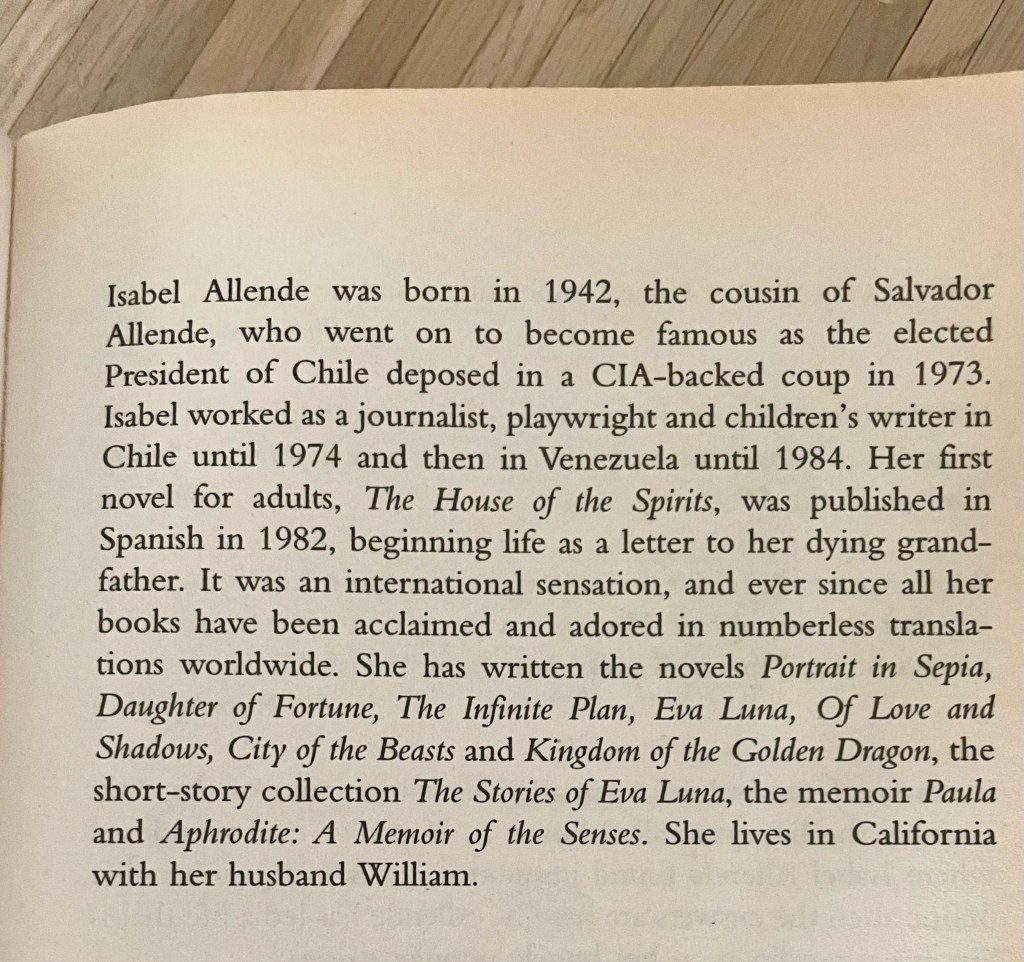 I found her writing imaginative, and the life, fascinating and eventful. Both her personal and professional life as a journalist and writer gave her many homes across the world. Isabel Allende was away from Chile since 1988, and only visited it yearly. Therefore she felt she had to partly ‘invent’ her native country in order to write about it 30 years later.