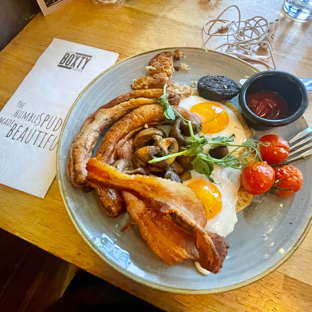 My first stop in Dublin was to Boxty House, created by Chef Pádraic Óg Gallagher, at the address: 20-21 Temple Bar. I had the Irish breakfast to try this boxty, sausages, Black & White Pudding, plus two fried eggs, roasted tomatoes and mushrooms. In the second morning, I had a sweeter breakfast – the Irish scone with Irish butter and jam, next to fruits and coffee. Best of both worlds.