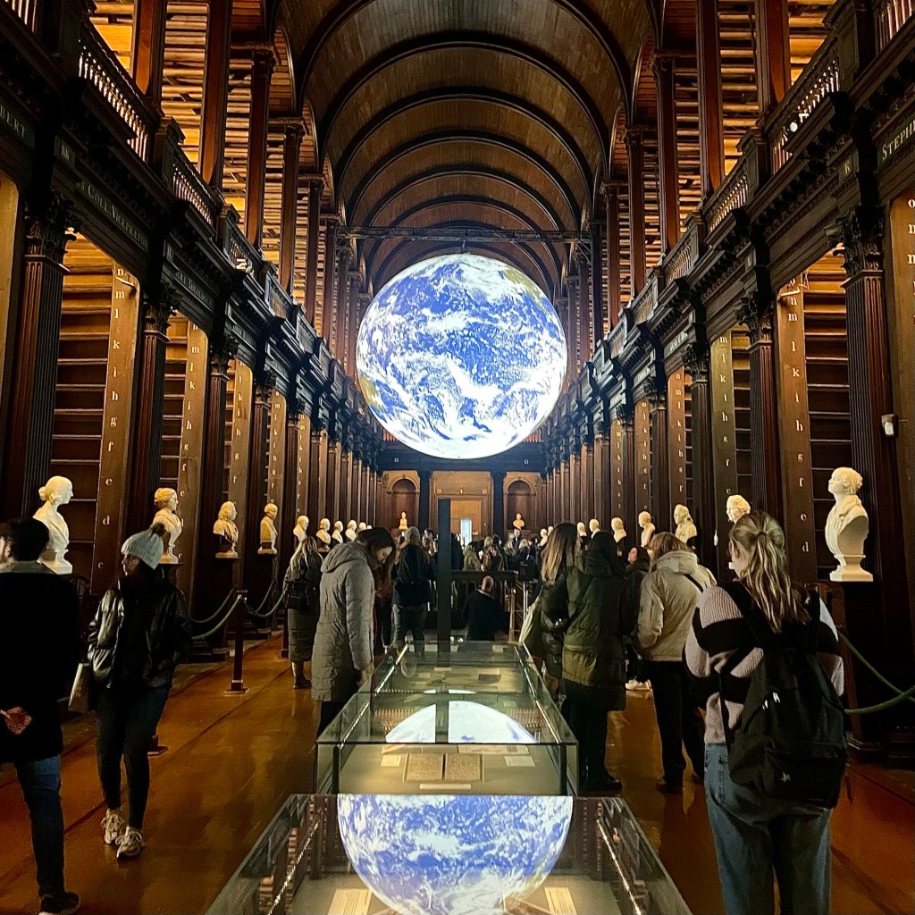 However, stepping in the Old Library, I was not expecting to see in the Long Room also the Gaia art installation by artist Luke Jerran, showing an impressive luminous image of Earth. In Greek mythology, Gaia is the personification of Earth. As I also read on the university website afterwards that “the installation features NASA imagery of the Earth’s surface, showcasing the planet floating in three dimensions as it might be viewed from space.”