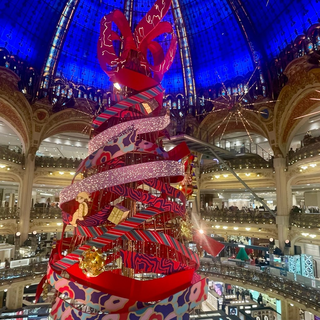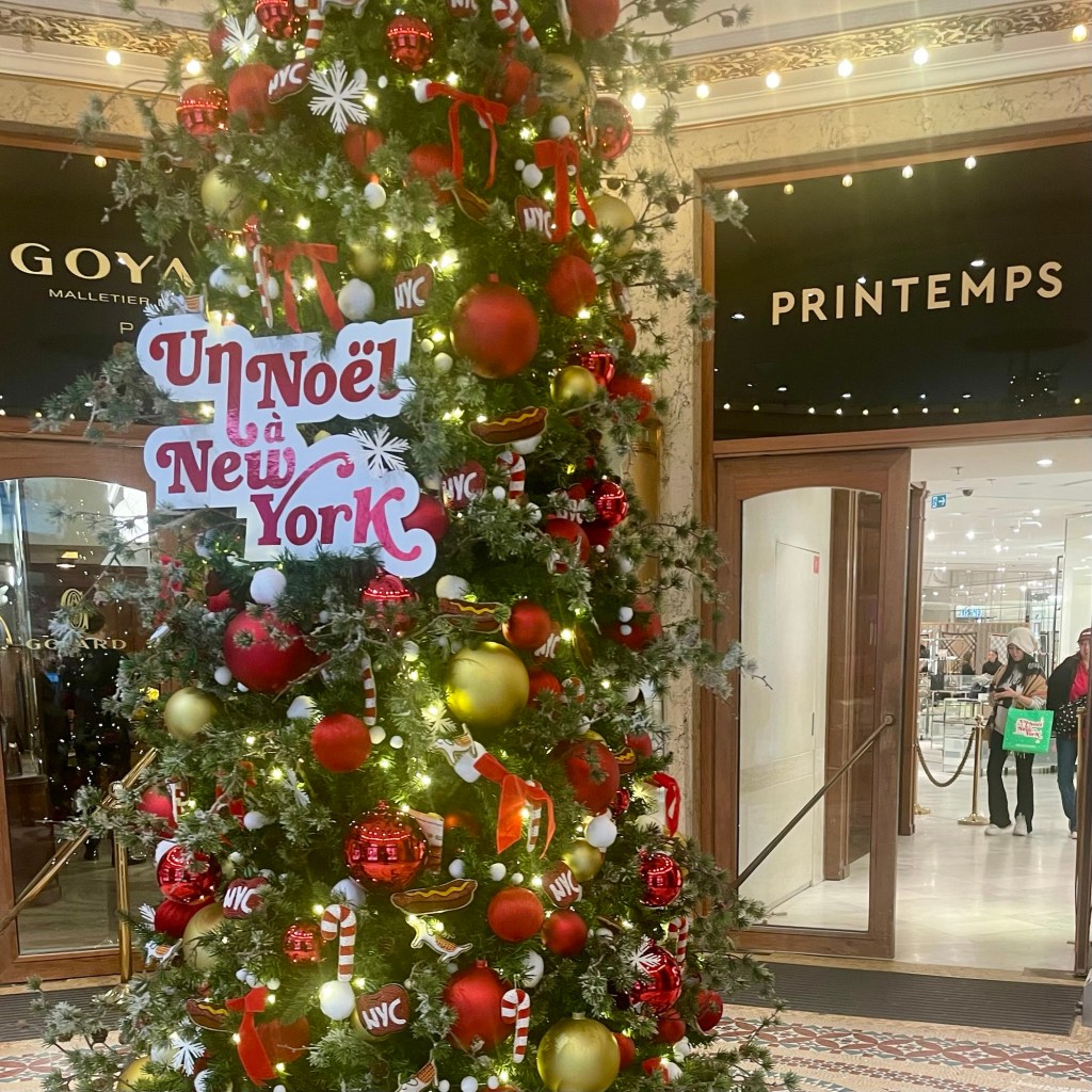 Especially outside Galleries Lafayette – the windows displays are beautiful, and the 2025 Christmas theme is “The loveliest of gifts” (Le Plus Beau des Cadeaux), according to parisjetaime.com. By illustrator Jeanne Detallante, it shows a Christmas workshop were elves are wrapping presents. While nearby Printemps Haussmann theme this year is “Christmas in New York”, inspired by Manhattan, celebrating the opening of the first Printemps store in America.